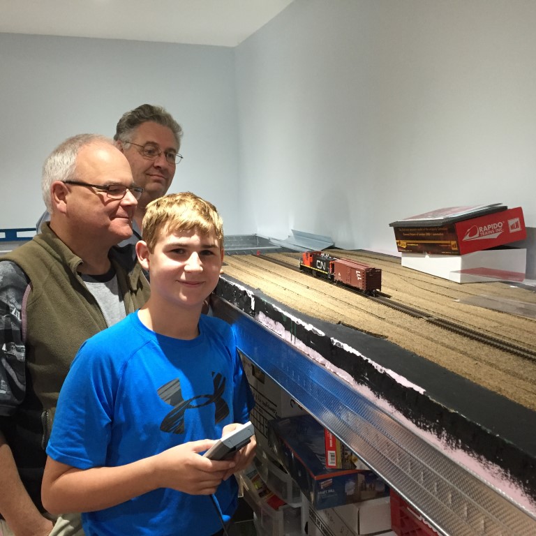 train. Dustin is at the throttle while Rob and Michael watch.