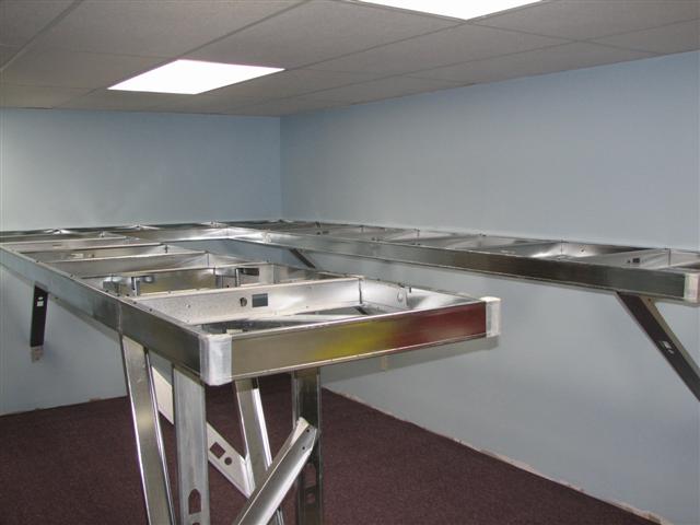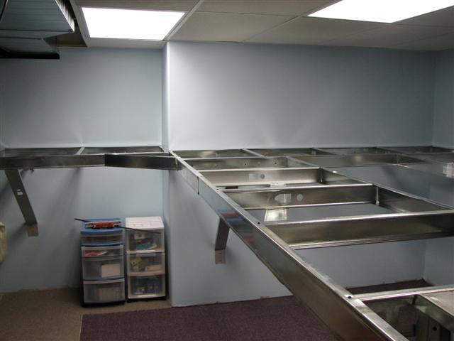 The bench work went up in just over 6 hours using steel studs and C channel and 200 framing screws. This was inspired by a Model Railroader article last May and some recommendations from a friend of Robert's in Nova Scotia. It is rock solid and left behind no sawdust or glue stains, and a whole lot of time. The only portion left to build is a lift-out. The only tools we used were a drill, tin snips, level, square, stud finder and a hammer.